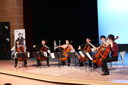 4月24日晚,学院实验剧院一千来师生聆听世界著名大提琴家、指挥家朱亦兵先生演奏的天籁之音,这是朱亦兵携他的中央音乐学院大提琴乐团2011地方高校巡演之湖南行最重要的一站。