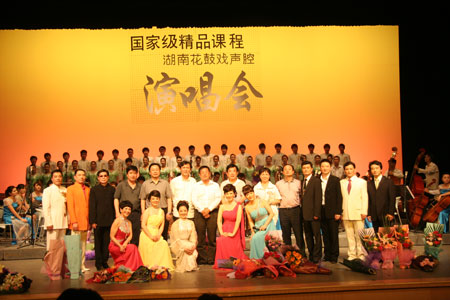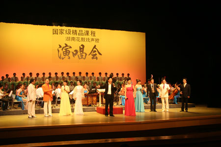 5月18日晚上,国家级精品课程—湖南花鼓戏声腔演唱会在实验剧院隆重举行。这是学院献给中国共产党建党90周年暨建校60周年的丰厚礼物,也是学院的国家精品课程《湖南花鼓戏声腔》的教学实践成果汇报会。