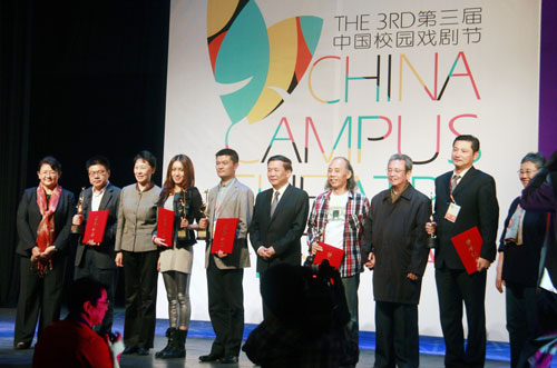 在近日举行的第三届中国校园戏剧节闭幕式暨颁奖典礼上,我院编排的话剧《永不凋谢的姊妹花》获得“中国戏剧奖·校园戏剧奖”,也是中国校园戏剧节剧目奖的最高奖“优秀剧目奖”。这是我院继音乐剧《同一个月亮》和花鼓戏《五十二家别墅》分别荣获前两届中国校园戏剧节优秀剧目后,再次获此殊荣。同时,学院还获戏剧节“优秀组织奖”,我院青年教师、该剧编剧蒋晗玉/翟清/陈俊获“校园戏剧之星”称号。副院长周文清代表学院接受了颁奖。