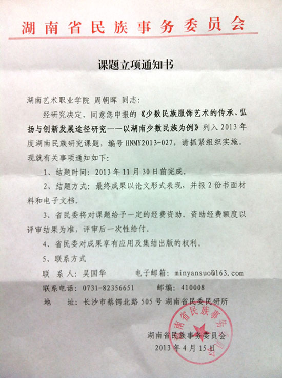 近日,从湖南省民族事务委员会传来喜讯,我院美术系周朝晖老师申报的课题《少数民族服饰艺术的传承、弘扬与创新发展途径研究——以湖南少数民族为例》已经成功立项。