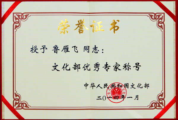 此次文化部优秀专家选拔,是根据《文化部办公厅关于开展2013年度文化部优秀专家选拔工作的通知》精神,文化部评选出了95名2013年度文化部优秀专家。鲁雁飞教授经推荐入围优秀专家行列,受到了文化部表彰,并应邀参加了2013年度文化部优秀专家座谈会,围绕高层次文化艺术人才队伍建设等方面内容进行了研讨。