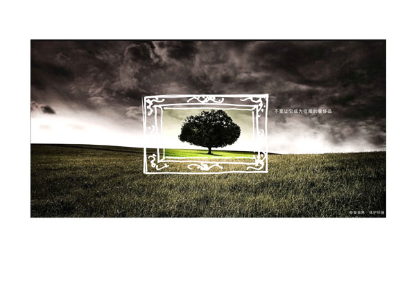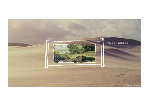 何进的《不要让它成为收藏的奢侈品》系列作品运用创意设计从草原退化、土地沙化等生态问题切入,拟人化地“不要让它成为收藏的奢侈品”设计主题,充分展示生态文明和建设资源节约型、环境友好型社会的内涵;同时,呼吁人们树立爱护自然和保护生态的意识,领会节约资源和绿色可持续发展的深远意义,并参与节能减排,形成文明、节约、绿色、低碳的消费模式和生活方式。