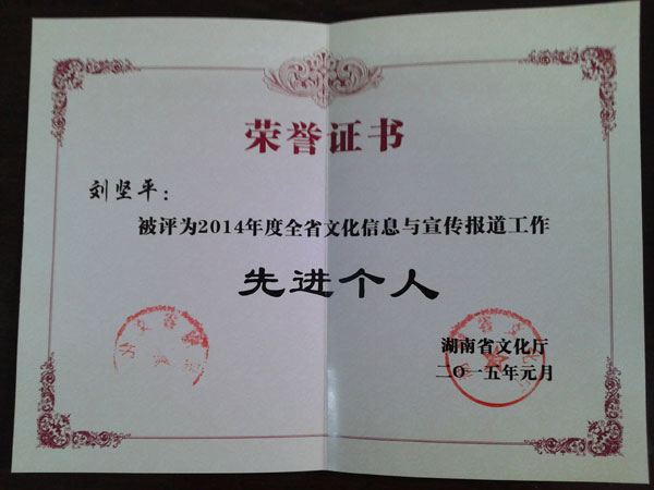 近日,湖南省文化厅通报表彰了2014年度全省文化信息和宣传报道工作先进单位,我院名列其中;刘坚平同志被评为2014年度全省文化信息和宣传报道工作先进个人。