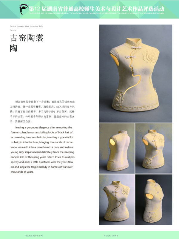 我院美术系教师张瑶燕作品《年前的守候》获教师组一等奖;周朝晖作品《古窑陶赏》获教师组二等奖;梅君艳、张楠、张艳武作品《相遇的电波》获教师组三等奖;黎波作品《环保轮胎椅》获教师组优秀奖。学生龙炎平作品《稻花湘》获一等奖,指导老师为聂进;蒋冬琴作品《Athena》获一等奖,指导老师为张晶晶;张雅静作品《Time Track》获二等奖,指导老师为周朝晖;李奥林作品《精在咫尺》获三等奖,指导老师为黎波;王雪莉作品《Colorful black—涂鸦工作室》、李莹作品《私人订制—办公空间环境设计》、唐清萍作品《素色主题餐厅设计》、吴晶晶作品《Pink Pearl》获优秀奖,指导老师为李海海、焦立强、许少玲。