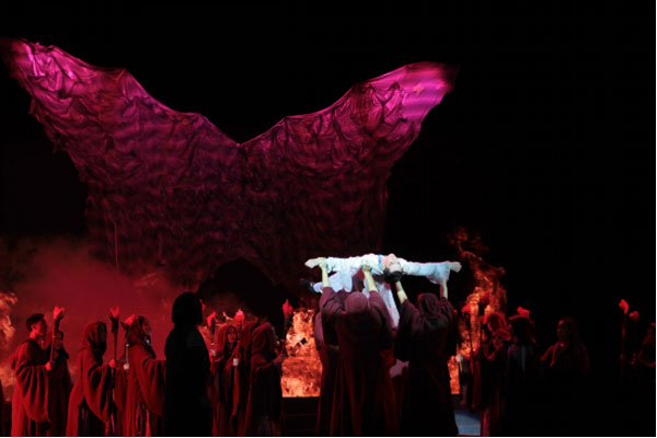 本场展演分为上、下半场两部分。上半场为《屋顶上的小提琴手》,以沙皇时代俄国一个小村庄为背景,剧情轻松幽默且发人深省;下半场为音乐剧《蝶人》,场面火热壮观,极富观赏性。学生们在欢快的节奏、跳跃的音符、人物角色中展现出当代大学生的青春,他们的细腻表演激发了观众的热情,现场高潮迭起,掌声不断。