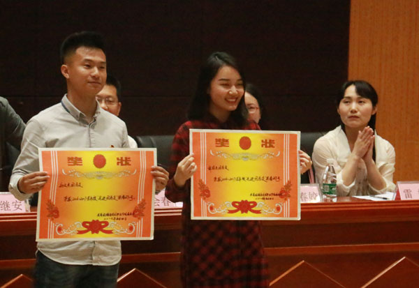 会议在庄严雄壮的国歌声中拉开帷幕。院团委书记邹煜向大会汇报了2016—2017学年度学院共青团工作。院团委副书记雷姣带领171名新团员向团旗庄严宣誓。刘家海同志宣读了“关于省直团工委开展创新创业创优活动和五型团组织标准化创建结果”的通报。余会春同志宣读了2016—2017学年度五四表彰决定,表彰了本学年度在学院团学工作中涌现出来的34个先进集体和279名优秀个人。在欢快的团歌旋律和阵阵掌声中,与会领导先后为获奖集体和个人先后颁奖。