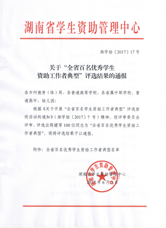 在湖南省学生资助管理中心组织的“全省百佳学生资助工作单位典型”及“全省百名优秀学生资助工作者典型”评选宣传活动中,我院荣获“全省百佳学生资助工作单位典型”荣誉称号,曹志超同志荣获“全省百名优秀学生资助工作者典型”荣誉称号。