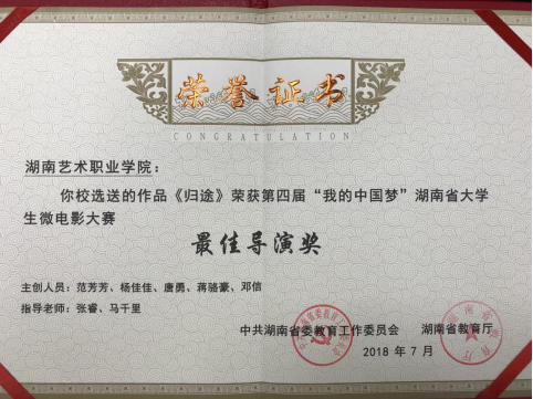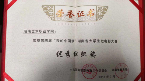 近日获悉,由省委教育工委、省教育厅主办,湖南教育电视台承办的第四届“我的中国梦”湖南省大学生微电影大赛赛果揭晓。我院影视系张睿、马千里、王馨平、王柳力、陈俊等老师创作的三部微电影分别荣获“最受欢迎影片奖”、“最佳导演奖”等八个奖项,我院获得“优秀组织奖”。