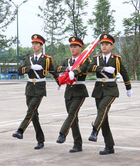 在雄壮的国歌声中,鲜艳的五星红旗冉冉升起,全院师生面向国旗行注目礼,齐唱国歌《义勇军进行曲》。