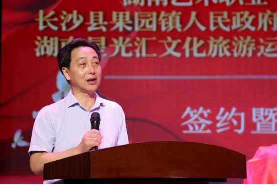 王章华代表学院致辞。他指出,此次校地企三方合作,要在原校地合作的基础上,进一步吃透“产教融合、校企合作”相关政策,拓展三方合作内容,要通过资源共建共享,开展以优秀传统文化为主要内容的文化旅游服务,助力果园镇乡村振兴发展。围绕下一阶段校地企三方各司其职、精诚合作,他提出五个方面工作意见:一是学院影视系要与地方融媒体中心合作,利用数字技术做好宣传,讲好好果园镇田汉文化园的故事,引来游客,做活经济,助力乡村振兴。二是学院戏剧系要充分发挥专业优势,保护、传承好地方戏曲,通过建立“非遗”传习所、推进“非遗”文化进校园,培养地方戏曲人才。三是学院文旅系要与地方有关部门合作,共同申报文化旅游、乡村振兴项目,争取政府资金支持,打造具有本地特色的研学旅游基地。通过资源共建共享,共同开发、开展以优秀传统文化为主要内容的研学旅游服务,吸引游客参与基地活动。四是要深化星河演出公司与星光汇公司的合作,通过排演田汉先生编剧的经典剧目、小戏、小演出等,同时申办田汉文化艺术节、中国校园戏剧节等大型活动,进一步增加果园镇的文化影响力。五是学院艺术培训部要利用全国基层文化队伍培训基地、全国文化干部培训基地的“金字招牌”和相关资源,面向乡村文旅人才等重点人群开展培训合作,主动沟通协商,狠抓项目落实,实现良好效果。
