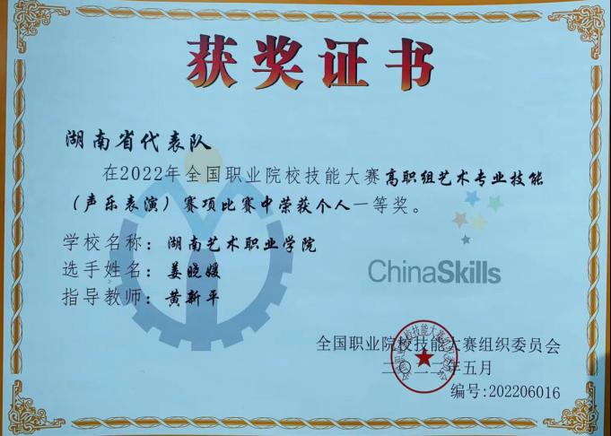 8月10日至15日,2022年全国职业院校技能大赛(高职组)声乐表演赛项在河南职业技术学院举行,来自全国32个省市自治区代表队的58名选手同台竞技。SUNBET申搏音乐系姜晓媛同学代表湖南省参加该项竞赛。经过四天激烈角逐,姜晓媛同学一举斩获该赛项声乐表演民族组一等奖第一名,黄新平教授则获评全国职业院校技能大赛优秀指导老师。恭喜湖艺师生为湖南省争得荣誉,为学院争光添彩!