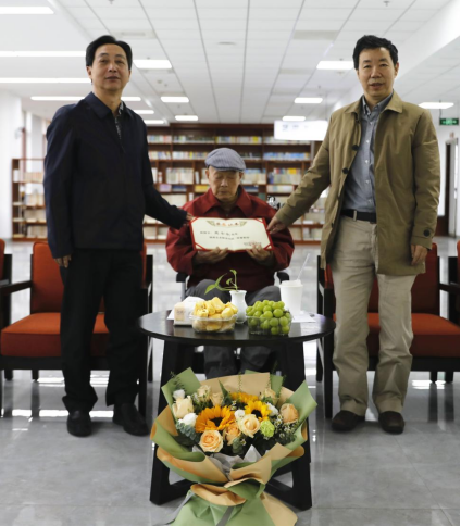 王章华、张勇代表学院,为周令钊先生颁发“终身荣誉教授”证书,并向周老赠送了具有纪念意义的醴陵大球泥毛主席浮雕瓷像盘。