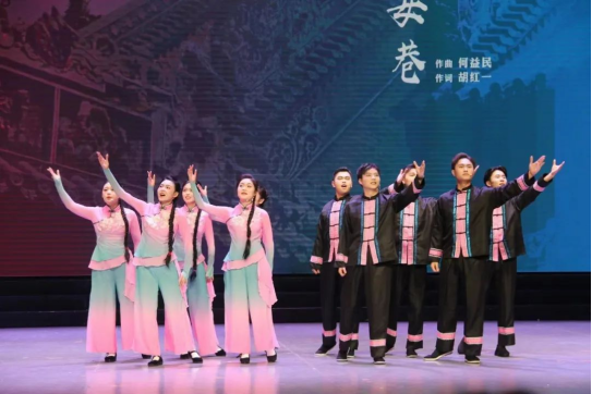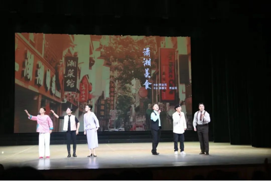 由音乐学院院长何益⺠教授牵头创作的《挤⼥巷》主要讲述了江永县上甘棠村一条狭窄小巷中,一群少年男女羞涩萌动的爱情故事。表演唱《潇湘美食》同样由何益民牵头编创,该曲以糖油粑粑、臭豆腐等长沙美食为切入点,编曲别出心裁,兼具趣味性与地方特色。