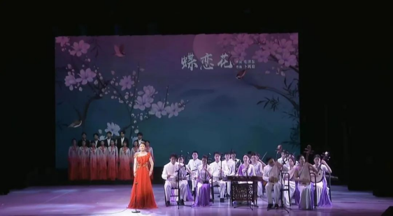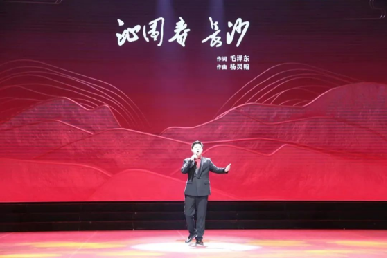 演唱部分,戏曲联唱选自花鼓戏《补锅》,并加入湖湘戏曲音乐元素,别有一番韵味。《蝶恋花》则采用戏歌和乐队融合的形式,将原诗词中伟人对革命伴侣的无限深情以及对革命道路的坚定信念表达得淋漓尽致。无伴奏合唱《海哥哥的歌》在传统花鼓戏《刘海砍樵》的基础上推陈出新,混声合唱的形式令人耳目一新。男声独唱《沁园春.长沙》将长沙弹词融入流行音乐,塑造了一代伟人的高大形象。