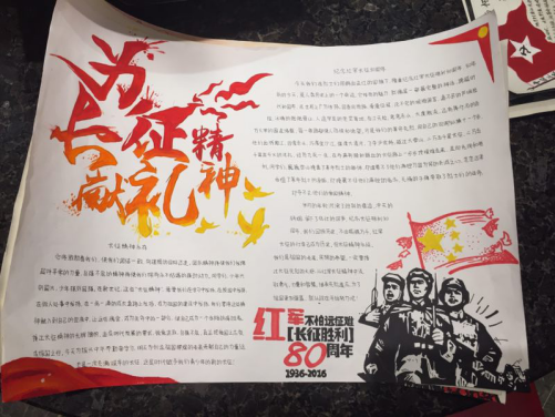 此活动内容为:一是以手抄报(用4K的纸)、绘画、摄影、PPT等形式,记录中国共产党和红军如何完成二万五千里长征路;二是观看一部长征影视剧,了解一个长征故事,阅读一本讲述长征历史的书籍,用文字(不少于1500字)写出自己的真实感想;三是寻访一位老红军战士或革命老前辈,用视频形式记录下来;四是做一件弘扬长征精神的有益小事,以摄影作品、视频、微电影等形式展示;五是学唱一首反映长征精神的歌曲,用视频形式展示,或者自己谱写一首反映长征精神的歌曲。活动时间从2016年10月10日到2016年12月1日。活动对象为全院大一学生。政史教研室对学生提交的采访或参观视频、手抄报、学习心得、PPT等活动作品进行评比。12月9日,政史教研室对各系初评的作品进行集体最终评比。经过评比,参赛作品共有87件获奖。其中,获得一等奖的作品有11件,二等奖作品26件,三等奖作品50件。