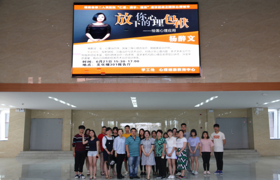 6月21日下午,由湖南省高校大学生心理健康教育研究会与湖南省第二人民医院(湖南省精神卫生研究中心)联合开展的“仁爱,携手,服务”大学生心理健康巡诊活动在我院举行。省第二人民医院临床心理科心理治疗师杨醉文专家应邀来学院开展了主题为“放下你的心理包袱——绘画心理应用”的团体辅导活动。学工处处长曹志超,学工保卫党支部书记、心育中心主任陆端新及心育中心全体专职教师热情接待了专家,并就学院心理健康工作开展情况以及双方在大学生心理健康教育领域的合作问题做了交流探讨。