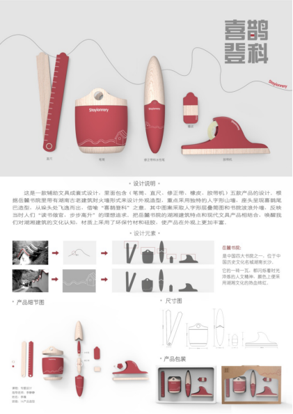 近日,2018年湖南省大学生工业设计大赛评选结果揭晓,我院美术系产品设计专业学生获得佳绩,有4件作品被评为三等奖,分别是李薇的《喜鹊登科》、杨巧莉的《“鼓楼”系列餐具设计》、祁明慧的《喜团圆》及谭思的《湘染—枫》。