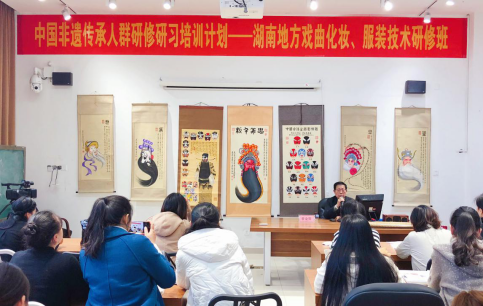 近日,我院特邀著名表演艺术家、国家级非物质文化遗产——湘剧代表性传承人,被誉为“梨园怪才”的曾金贵老师,在华艺楼(原美术楼)102室为“湖南地方戏曲化妆、服装技术研修班”作《湘剧脸谱》专题讲座。