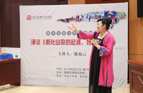 6月10日晚,国家二级演员,国家级非物质文化遗产----新化山歌的市级传承人,全国“十大山歌歌王”,文化和旅游部重点扶持歌剧《英雄》山歌领唱,娄底市第一批非遗传承学校——新化县文化艺术职业技术学校副校长陈福云老师应邀来到我院,为师生们作“新化山歌文化”专题讲座。学院学生工作处、科研处、音乐系有关负责人与200余名学子共同聆听了讲座。