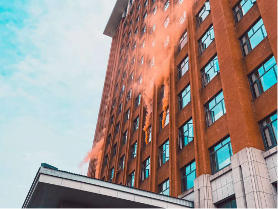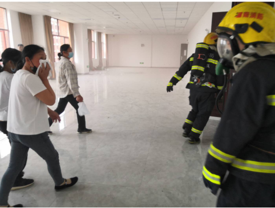 演练开始,博艺楼出现阵阵浓烟,随后消防警报响起,“火势”迅速扩散,楼内“被困人员”纷纷开窗呼救。学院微型消防站工作人员迅速集结,展开针对初起火灾的扑救,并组织人员疏散。