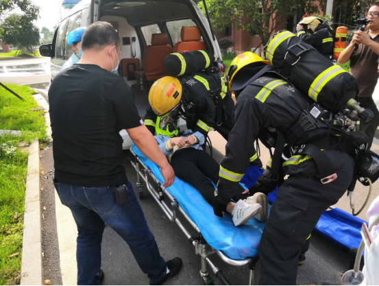 全副武装的消防官兵进入“着火”楼栋,搜寻被困人员并指引、疏导他们拿湿毛巾或袖子捂着口鼻,有序撤离。到达安全地带后,立即对人员进行清点,对于仍被困在大楼内的人员,迅速组织搜救并送往临时医疗点,由医护人员进行止血、包扎、运送等救治。经过紧张而有序的扑救,最终“大火”被成功扑灭。