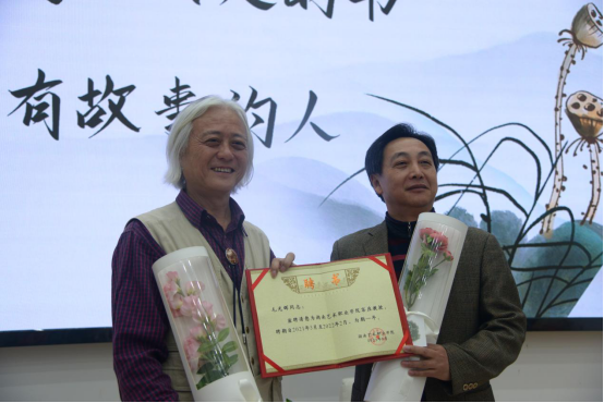 王章华赞赏毛光辉“有情有义有才有趣”——对母校、对家国情深意切,对艺术、对生活坚守初心。他还代表学院向毛光辉颁发了客座教授聘书,希望他带领湖艺学子为社会奉献更多更好的作品。