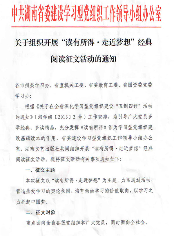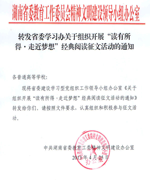 转发省委学习办关于组织开展“读有所得走近梦想”经典阅读征文活动的通知