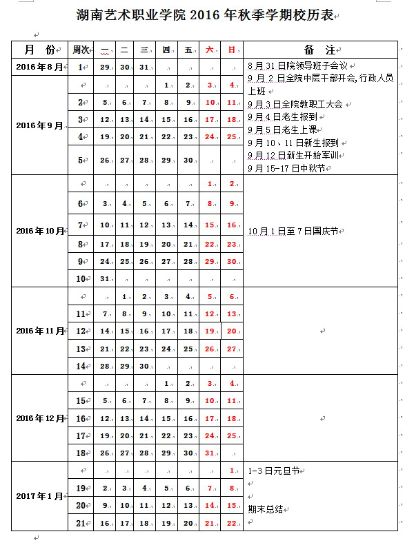 SUNBET申搏2016年秋季学期校历表