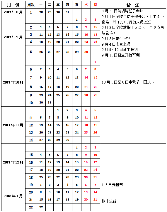SUNBET申搏2017年秋季学期校历表