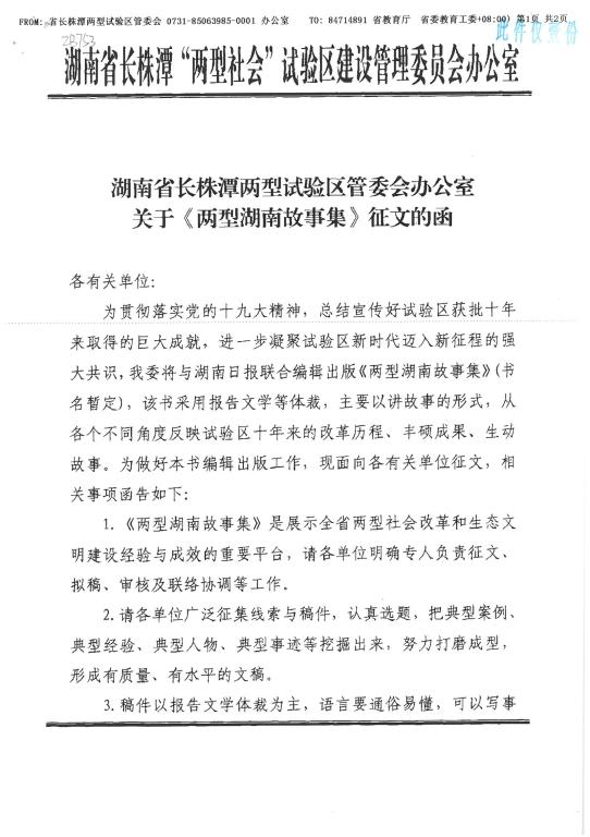 现将省两型委《关于<两型湖南故事集>征文的通知》转发给你们,请根据通知要求,明确专人负责,积极组织征文活动,相关材料请于5月24日前报党政办。