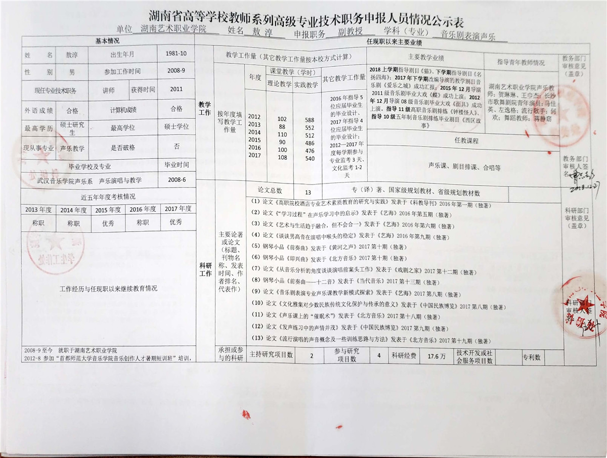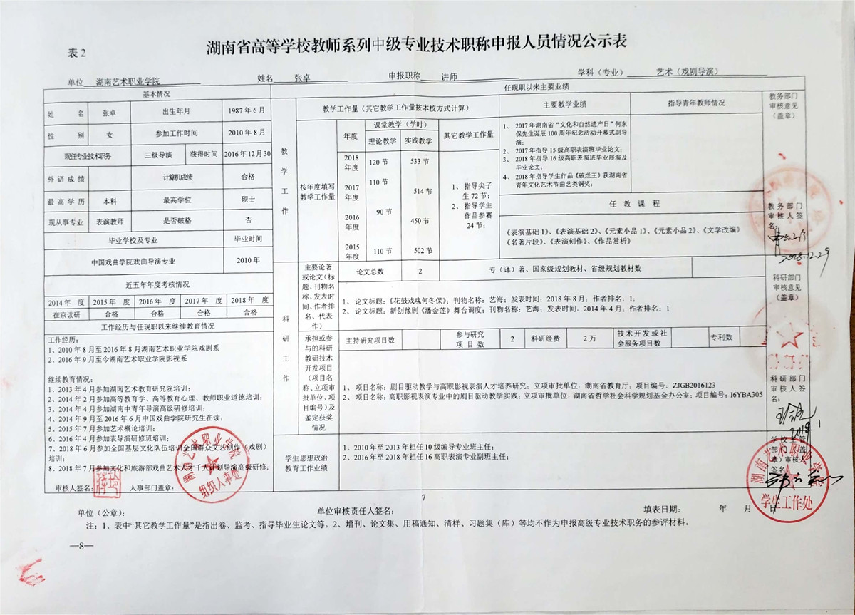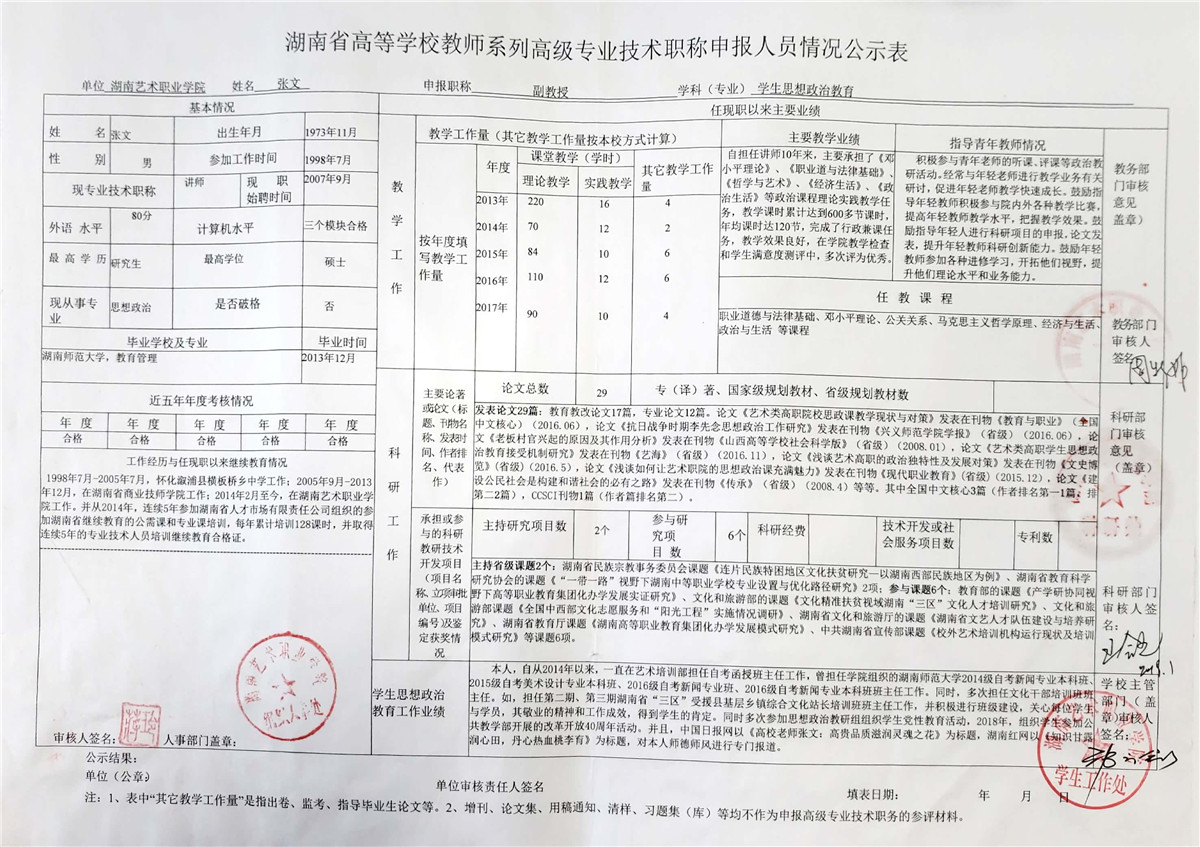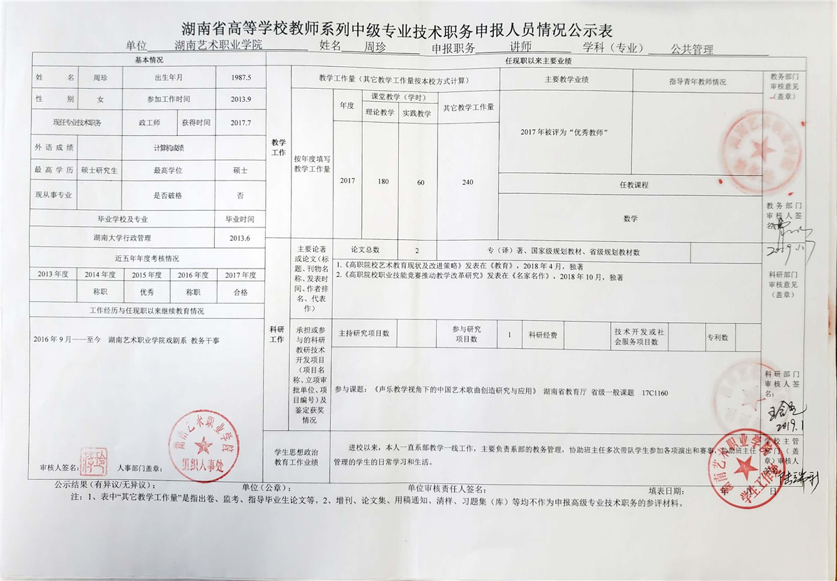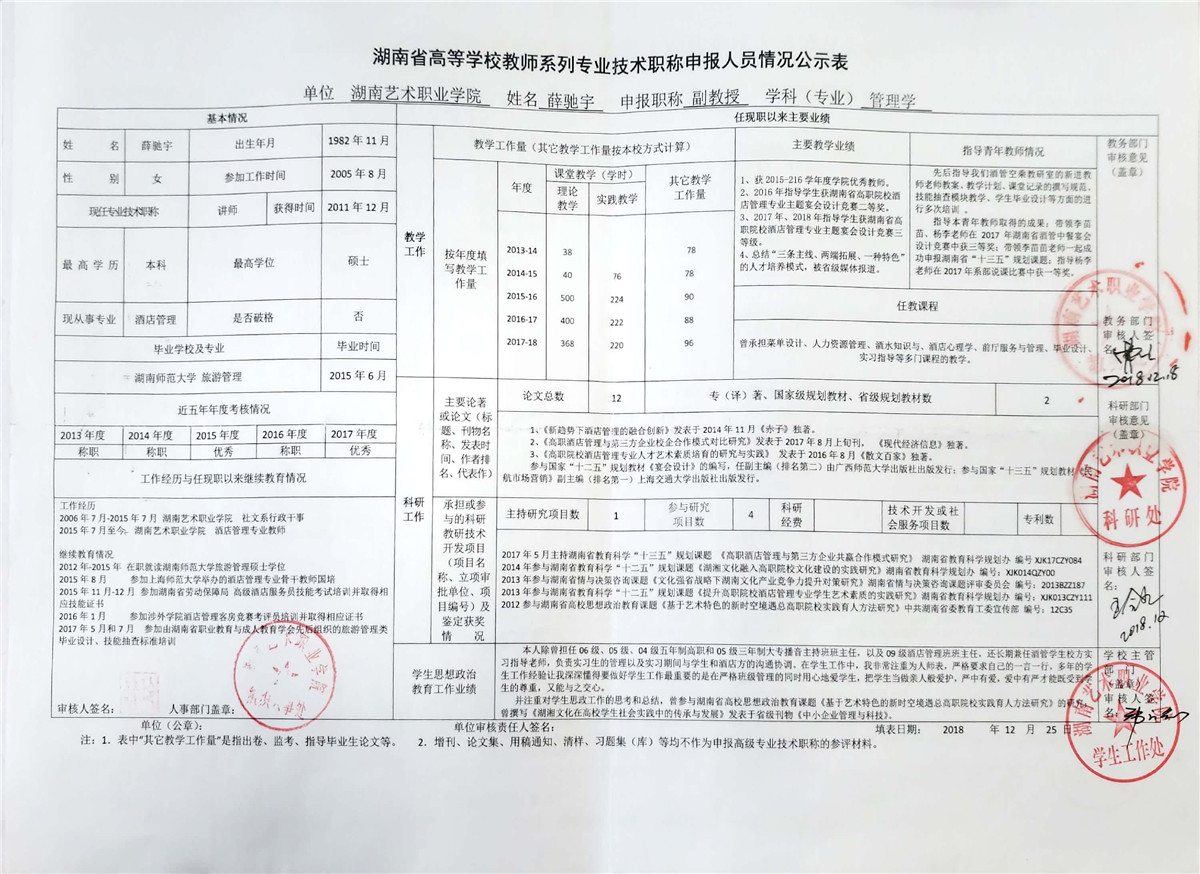 学院今年有27位同志申报评审高校教师系列职称,按湘教通【2018】506号《关于做好2018年度高校教师系列专业技术职称评审工作的通知》规定,结合学院湘艺职院【2019】2号《SUNBET申搏2018年高校系列专业技术职称评审工作方案》,现将以下同志的专业技术职称申报情况公示表予以公示。