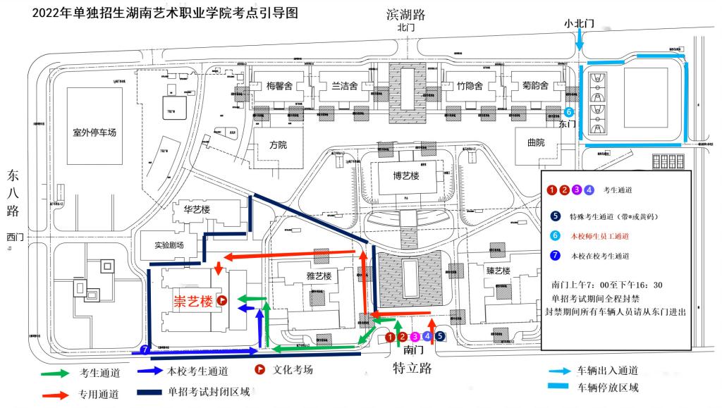 7.“绿码”考生从学校南门进入,“黄码” 和行程码带“﹡”号考生从南门专用通道进入考点(详见考场示意图)。