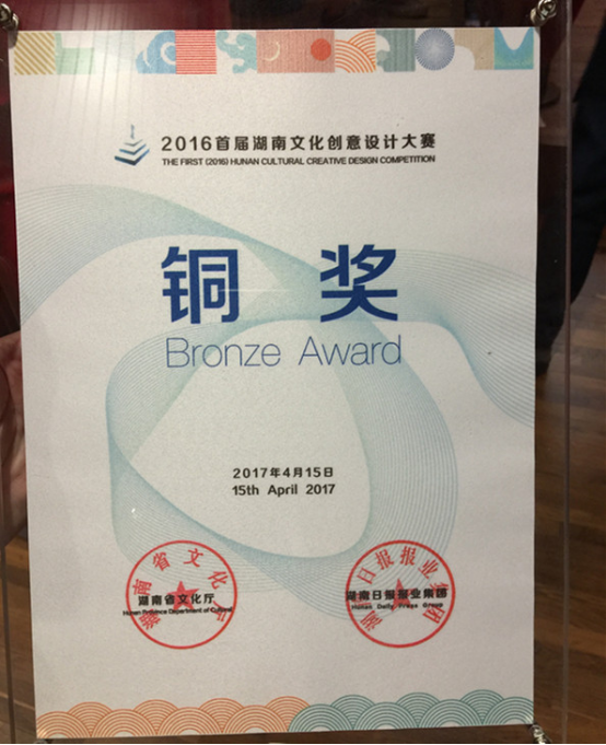 4月15日,经湖南省人民政府批准,由湖南省文化厅、湖南日报报业集团主办,湖南大学设计艺术学院承办的首届湖南文化创意设计大赛颁奖典礼在长沙市音乐厅举行。本次大赛共征集到4000多件作品,经过初赛、入围赛、决赛等阶段,我院美术系副主任黎波、教师李浩指导,产品设计专业刘佳雯同学设计的作品《锦画银钩》,荣获铜奖。