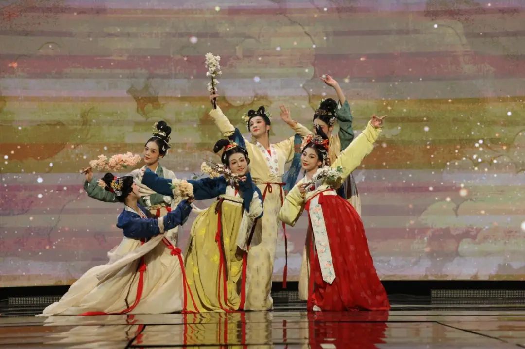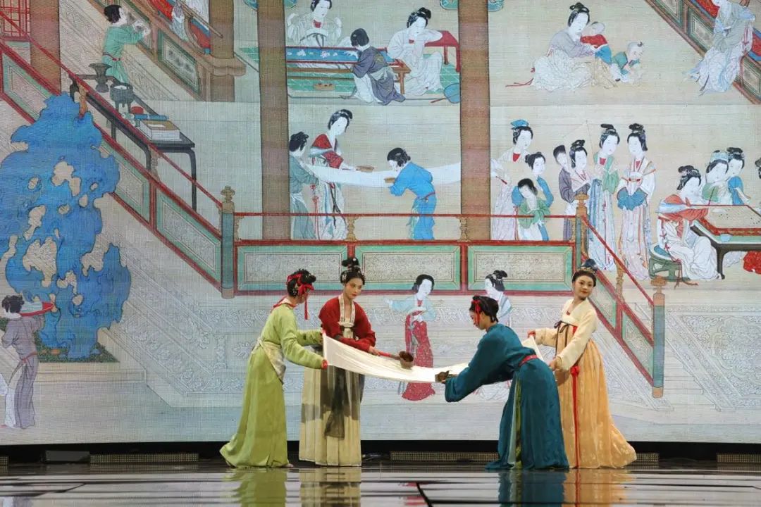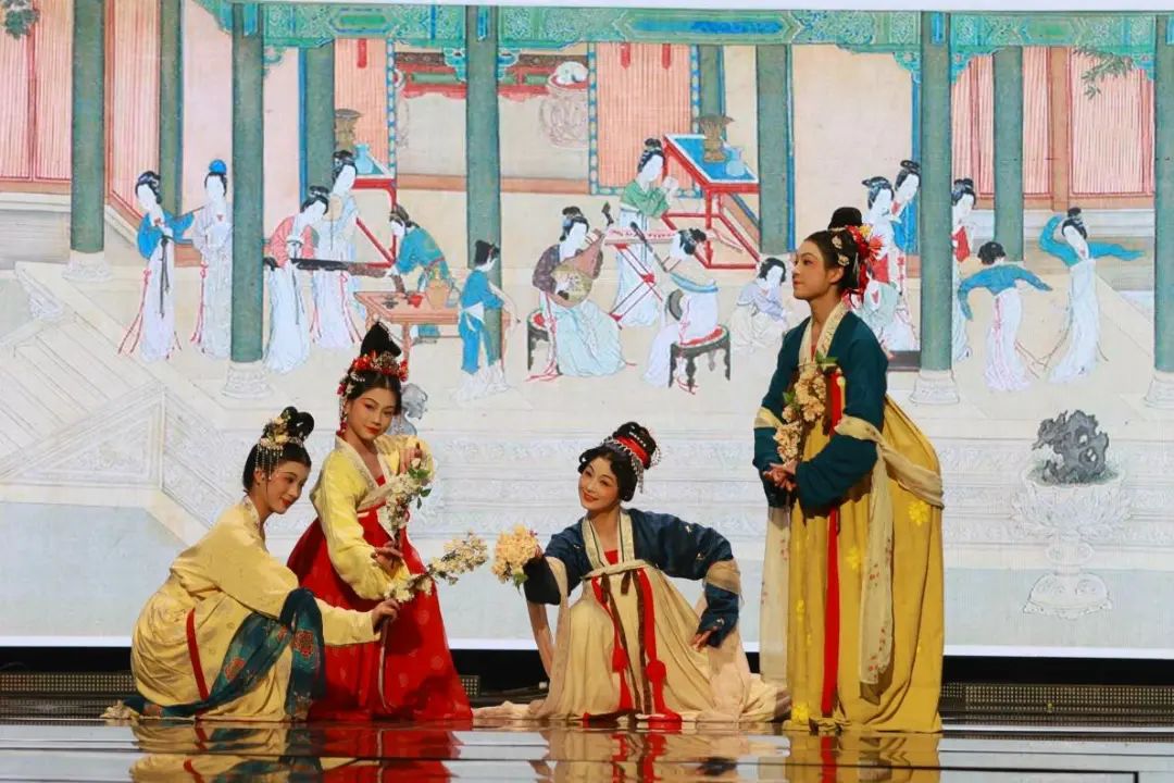 本次演出创造性地采用沉浸式人物造型艺术,借助舞台表演的方式,将中国古代传世名画《汉宫春晓图》活灵活现地“复刻”出来,画中人仿佛“出画入戏”一般,演员们优美的身姿、极富古韵的造型、灵动飘逸的表演,让观众更直观地领略到汉代宫廷春色满园的浪漫景象。