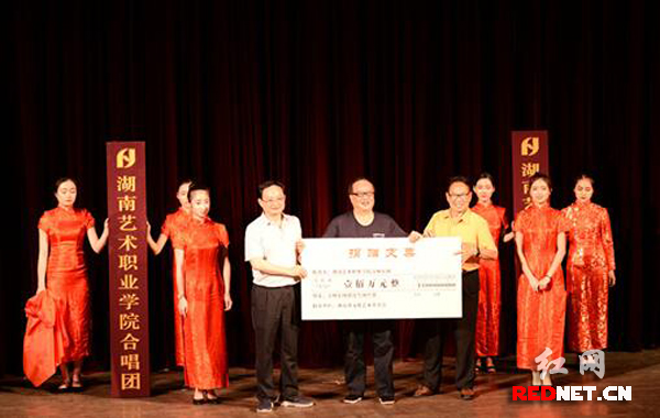 揭牌仪式上,肖雅瑜为交响乐团、合唱团揭牌,并与杨汉林一起代表湖南省文化艺术基金会向交响乐团交予100万资助支票。