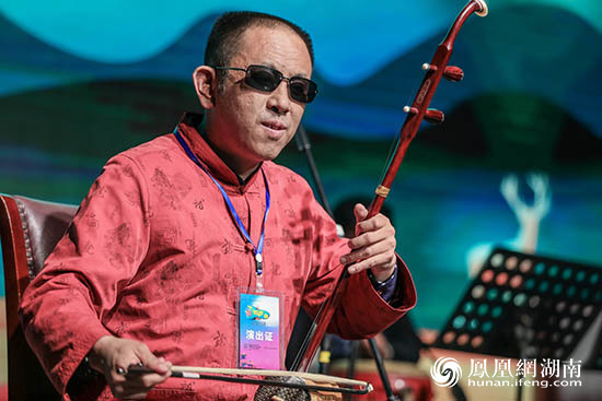 在众多参演选手之中,黄腾芳格外引人注目。这位来自益阳的选手,有关他的一段视频曾在网上流传。视频之中,一位双目失明的表演者,在长沙湘江风光带专注地自拉自唱《四郎探母》,不时引发围观者的阵阵掌声。当晚,这位视频中的主人公,便是登上汇演舞台的黄腾芳,他以充沛的情感和精湛的技术,为观众呈现了一曲《朝霞映在阳澄湖上》。