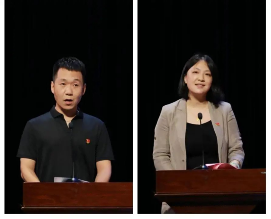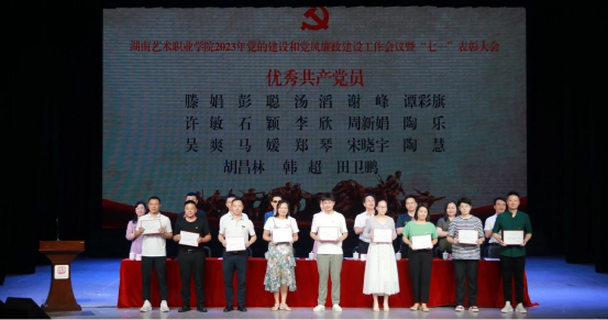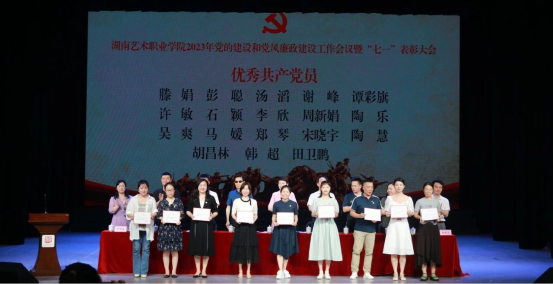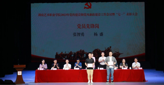 黄新平同志宣读表彰决定,获评优秀共产党员、优秀党务工作者、党员先锋岗、先进党支部的代表同志依次上台领奖。设计艺术学院党支部张智勇同志、公共教学党支部付媛媛同志先后作为党员先锋岗、优秀党务工作者代表发言。
