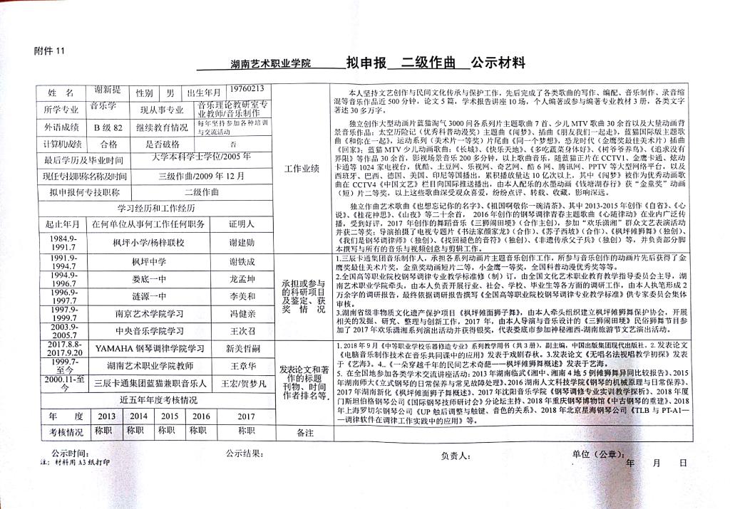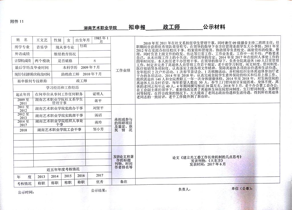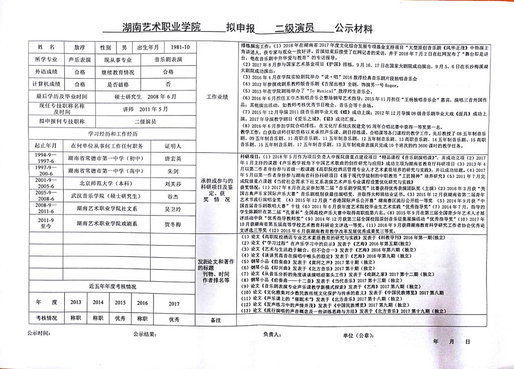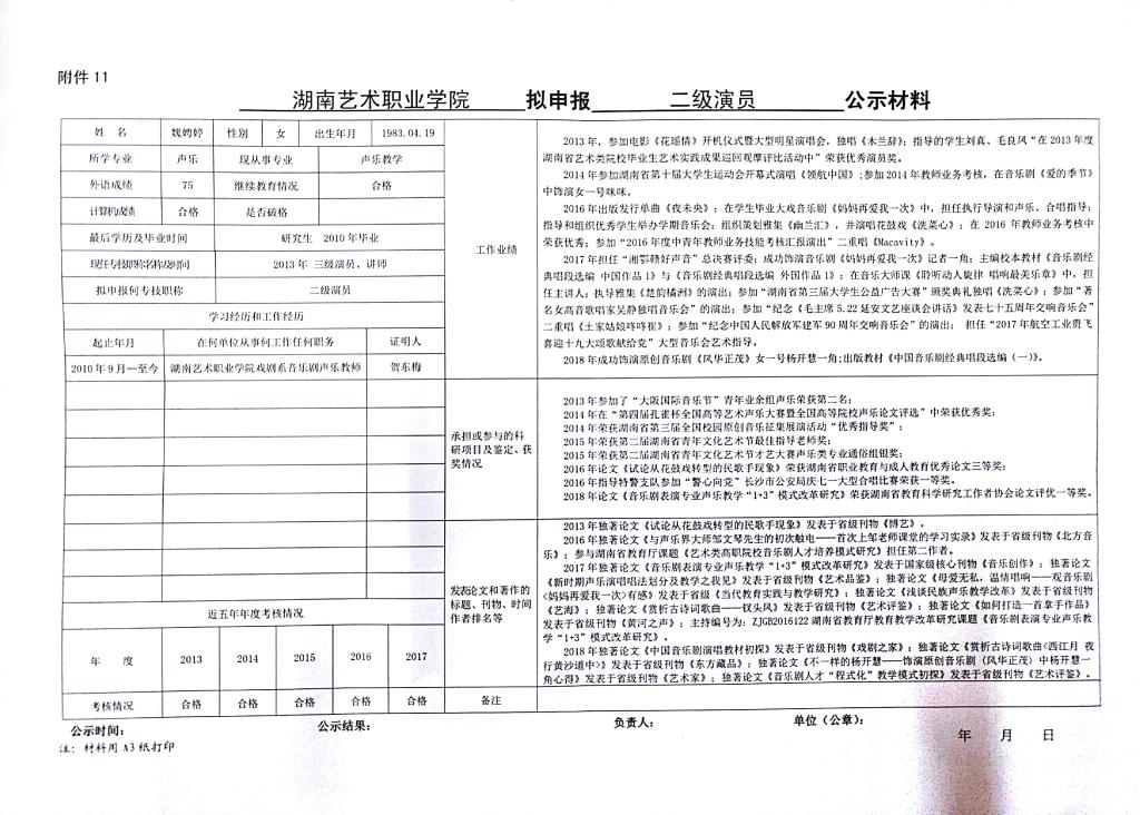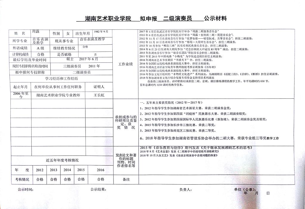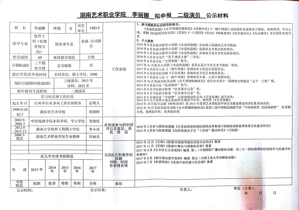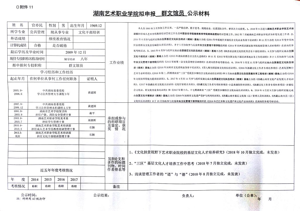 学院今年有24位同志申报艺术、群文、政工系列职称,按湘人社发【2018】51号《关于做好2018年度职称评审工作的通知》规定,现将以下同志的基本情况予以公示。