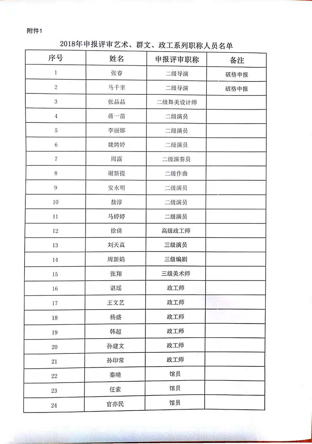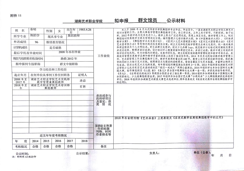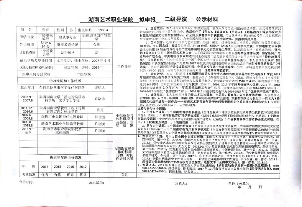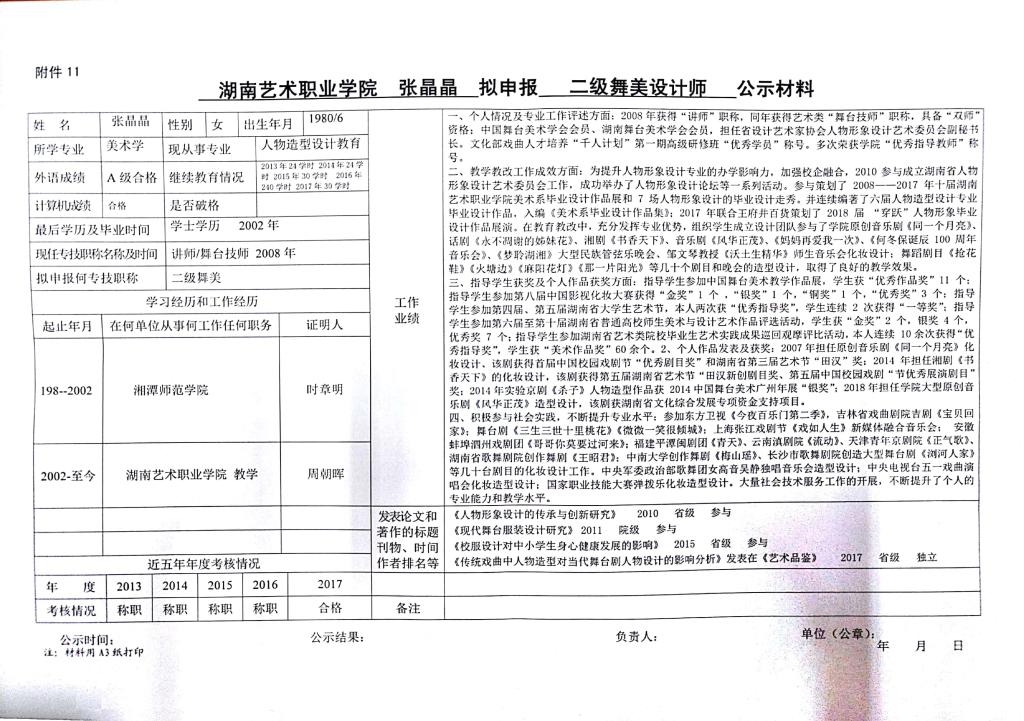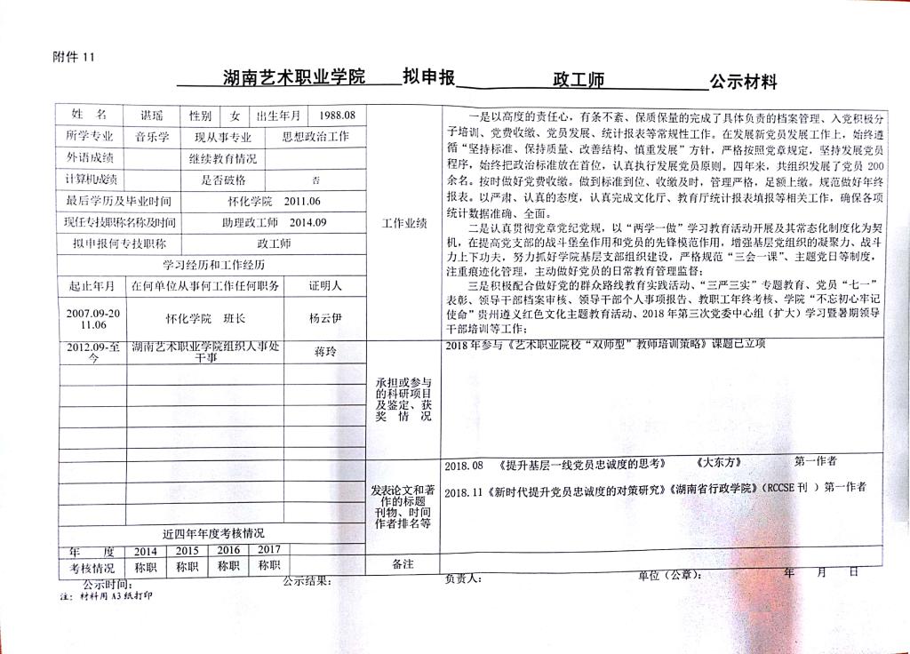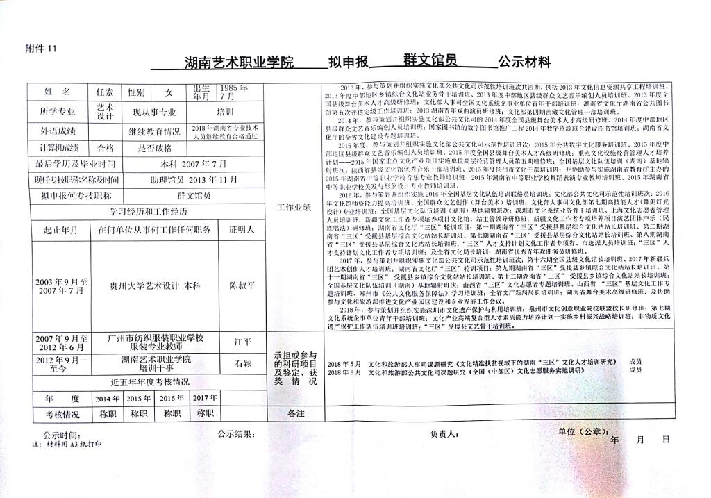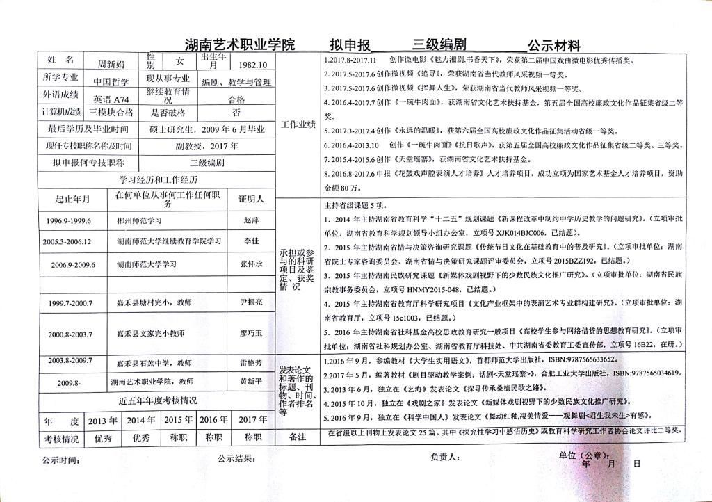 学院今年有24位同志申报艺术、群文、政工系列职称,按湘人社发【2018】51号《关于做好2018年度职称评审工作的通知》规定,现将以下同志的基本情况予以公示。