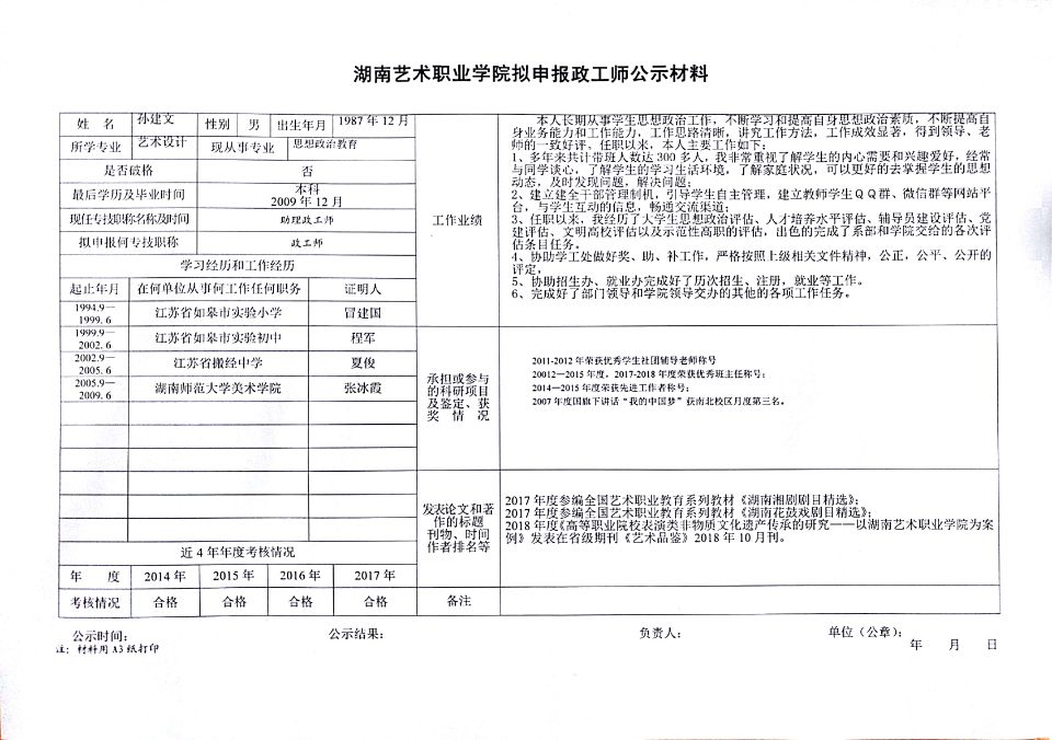 SUNBET申搏关于对申报2018年度艺术、群文、政工系列职称人员情况的公示
