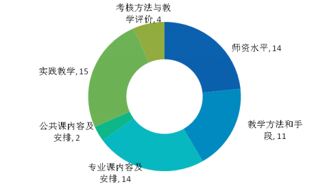 通过对母校亟需改进的方面做的调研的反馈,如下图所示:首先是学校在实践教学方面亟需改进的占为25.00%;其次是师资水平和专业课内容及安排方面亟需改进的占比均为23.33%,教学方法和手段亟需改进的占比为18.33%。