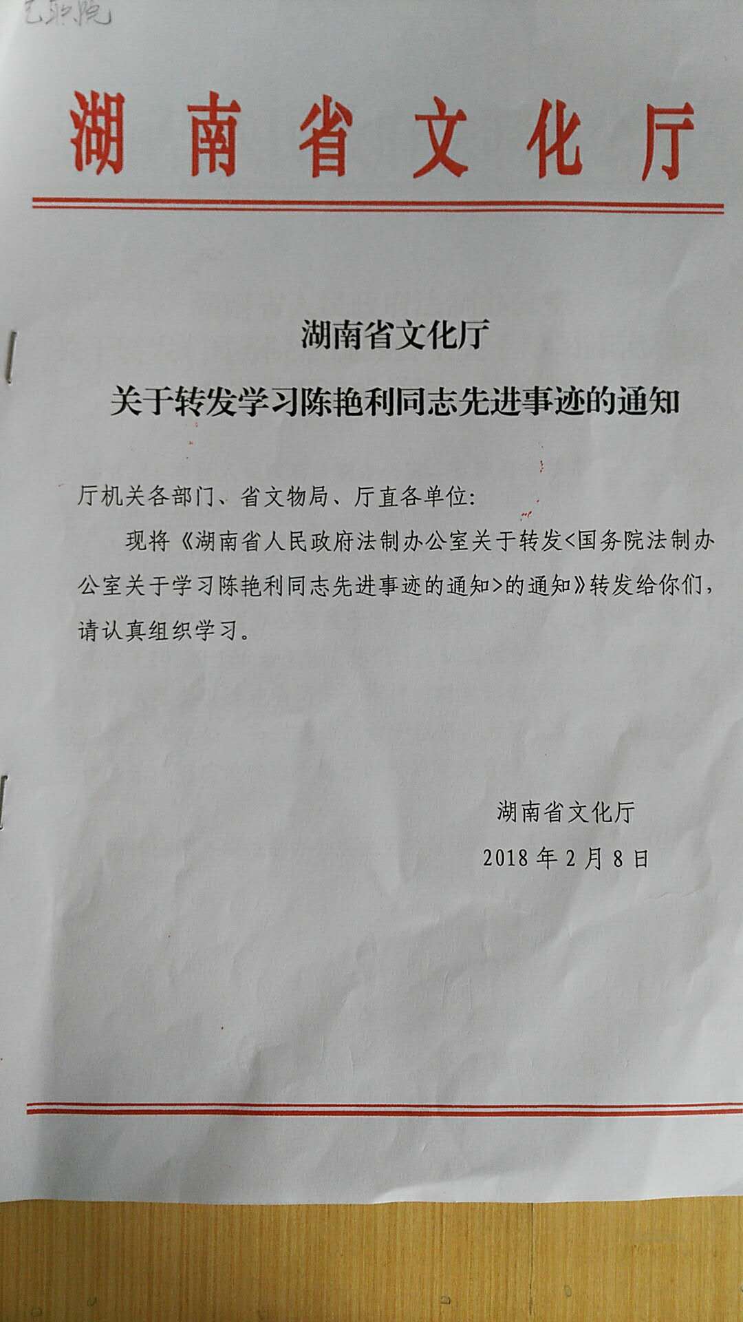 现将《湖南省人民政府法制办公室关于转发<国务院法制办公室关于转发学习陈艳利同志先进事迹的通知>的通知》转发给你们,请认真组织学习。
