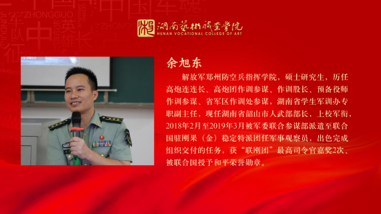 余旭东上校曾任联合国军事观察员、省军区作训处参谋、省军训办主任。他以《常怀忧患之心,多思安邦之策》为题,结合自己被派遣至联合国驻刚果(金)稳定特派团任军事观察员的切身经历,从“危机四伏、战乱纷飞的非洲国度”“守望和平、保护平民的维和行动”“硝烟弥漫、直面战场的工作经历”“躬身实践、至深至真的维和感悟”四个方面为同学们授课。