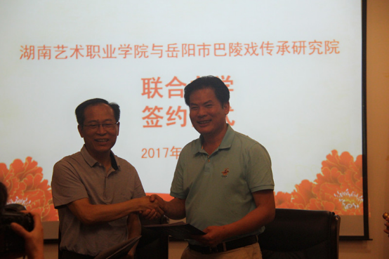 院长沈继安与岳阳市巴陵戏传承研究院院长魏传宝签约