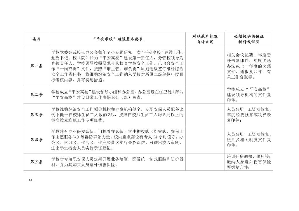 第十四条 校园治安状况良好,人均刑事案件发案率、学生非正常死亡率低于本省同类高校平均水平,对师生员工的校园安全感测评达到良好等级以上,近两年度社会管理综合治理考评达到合格等级以上。